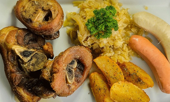 - O QUE ESTÁ INCLUSO: joelho de porco cozido e cortado e medalhões. Acompanha salsichas bock e branca, chucrute e batata rústica.