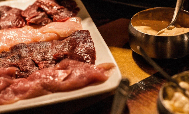 - Na sequência, é oferecido uma seleção de carnes, incluindo carne bovina, frango, suíno e calabresa, todas preparadas na pedra quente, permitindo que cada cliente escolha o ponto ideal de sua carne. Tudo isso é complementado por uma variedade de mais de 10 molhos, especialmente elaborados para tornar a experiência ainda mais saborosa.