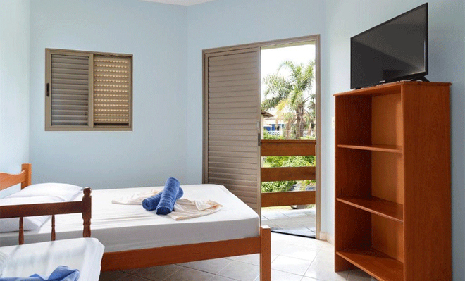 - QUARTO STANDARD: 1 cama de casal e 1 cama de solteiro, banheiro privativo, ventilador de teto, TV e geladeira.