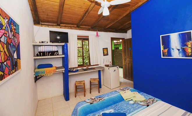 - ACOMODAÇÕES: cama de casal, ventilador de teto, frigobar individual, internet sem fio (WiFi), serviço de camareira, banheiro individual, chuveiro multitemperatura e estacionamento fechado.
