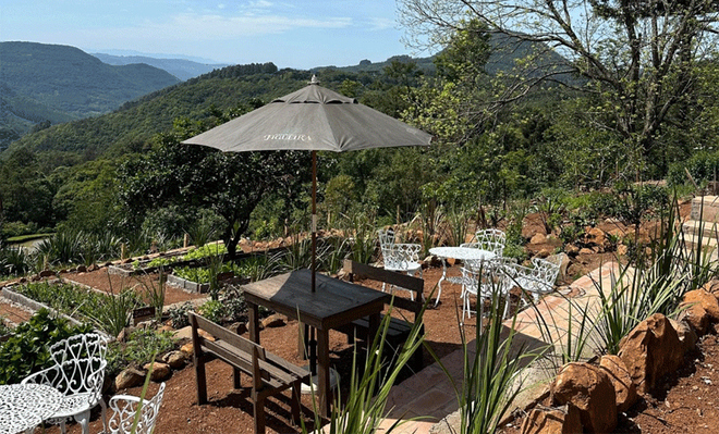 - Você pode optar em almoçar debaixo de uma imensa figueira, em um deck com cadeiras confortáveis para ter a vista ou na parte interna do restaurante, principalmente para os dias mais frios e com vento.