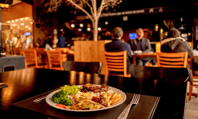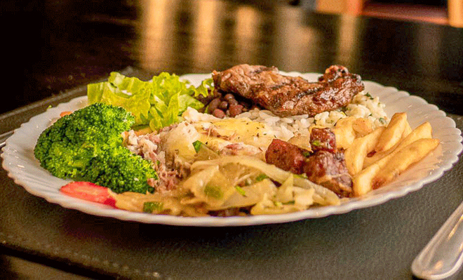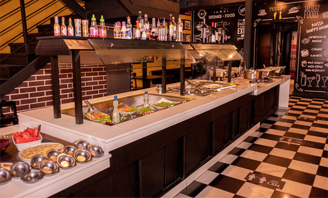 - Buffet livre com um variado cardápio, arroz e feijão com aquele tempero especial, saladas, massas, risotos, acompanhamentos, carnes e sobremesas.