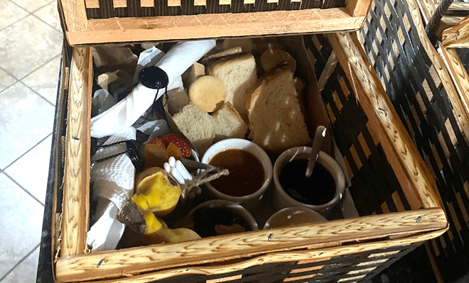 - CESTA DE PIQUENIQUE PARA 2 PESSOAS: queijo colonial, queijo provolone, salame colonial, copa, torresmo prensado, grissini, frutas da estação, morango e damasco, pão de massa sovada, bolacha da nona, pão de fermentação natural, doce, nata, suco de uva e água.
