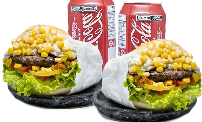 - OPÇÃO 2: hambúrguer duplo cheddar com pão, carne e queijo cheddar. Acompanhado de uma coca-cola lata 350ml, maionese caseira e sache de ketchup.